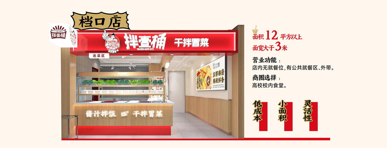 點單模式為消費者通過自選菜品后稱重付款進行選購,米飯免費自助,產品以“拌”為核心,以干凈、休閑、活力的形象出現,力求在工作、學習生活中打造快節奏餐飲體驗。在門店日常經營中, 操作簡單,出餐速度快,無需單獨的湯底,只需在翻滾的大鍋中燙熟然后加入秘制即食調料,在專用容器中攪拌出餐,這就是干拌冒菜。